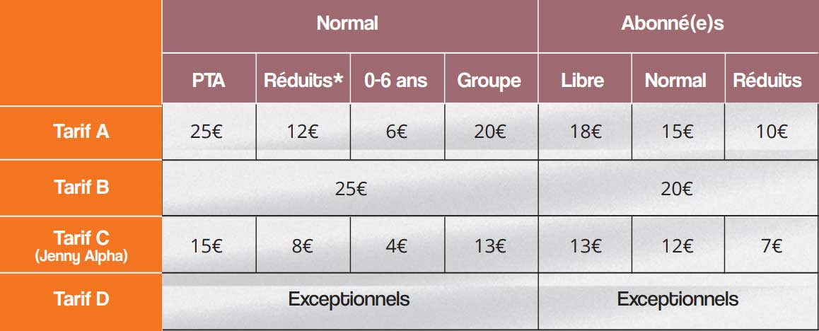 *sur présentation d’un justificatif le tarif réduit sera appliqué à votre statut d’abonné·e ou de non abonné·e·.